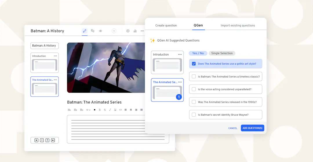 Here's how it works: simply choose a cheat sheet from within a course and our tool will automatically suggest questions to ask your learners based on the selected content. Once the questions are ready (which only takes a few seconds), you can review or modify them as needed. In other words, the AI proposes, and you approve—because nobody knows your content as well as you do.